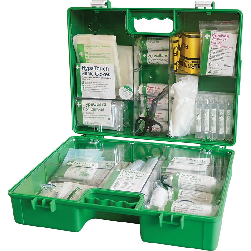 - Contents: Includes items such as sterile dressings (various sizes), plasters, nitrile gloves, foil survival blanket, eye wash pods/bottles, burn dressings, bandages (triangular, conforming), safety pins, cleansing wipes, tape, shears/scissors. Exact quantities and types would need verification from the product listing or manufacturer.