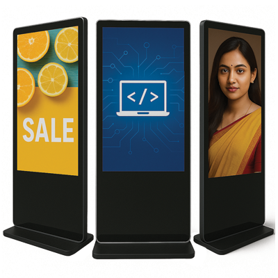 The 65-inch kiosk is a freestanding digital display unit designed for information sharing, self-service, advertising, and interactive applications in retail stores, malls, banks, hotels, and public areas. It combines sleek aesthetics with powerful performance, offering both touch and non-touch options.